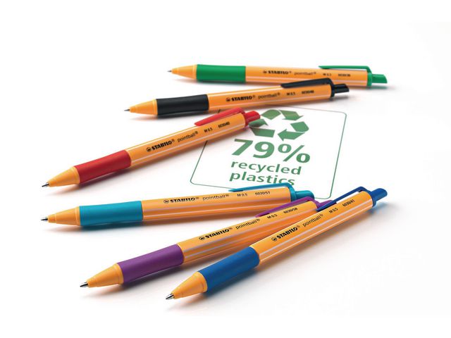 STABILO® pointball®-pennorna är tillverkade av 79% återvunnen plast. De har ett mjukt bläckflöde som tillfredsställer även de snabbaste skribenter och författare. Den här kulspetspennan från STABILO® har kvar stilen hos en 88®, fast med större komfort och ett halkfritt grepp. Den här robusta pointball®-pennan är gjord i 79% återvunnen plast, och den har en tillförlitlig klickmekanism för att dra in den fina spetsen när den inte används. Den här miljöanpassade produkten ger en smidig skrivupplevelse, tack vare det högkvalitativa bläcket, som dessutom är dokumentsäkert. Den kan fyllas på med STABILO®-påfyllningsbehållare. - Tillverkad av 79% återvunnen plast - Klickmekanism - Kan fyllas på med refill-patroner - Spetsbredd: 0,5 mm - Skrivfärg: Blå - Färg pennkropp: Gul - Med dokumentsäkert bläck - Artikeln innehåller ett ämne upptaget på Kandidatförteckningen i kemikalielagstiftningen REACH, Bly CAS- nr 7439-92-1 i pennspetsen, i en halt över 0,1 viktprocent.