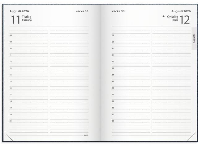 Kalender 2026 från Burde. Format: A6. Layout: Dag/sida. Timindelning 8-21. Kalendarium: 2026-01-01 - 2026-12-31. Omslag: Konstläder. Inbunden. Innehåll: Kyrkliga helgdagar, Flaggdagar, Helgdagar/aftnar, Månfaser, Namnsdagar, Internationella helgdagar översikt, Temadagar/händelser, Årsöversikt/årsöversikter, Årsplan/årsplaner. Antal sidor: 400. Miljöinformation: FSC®.
