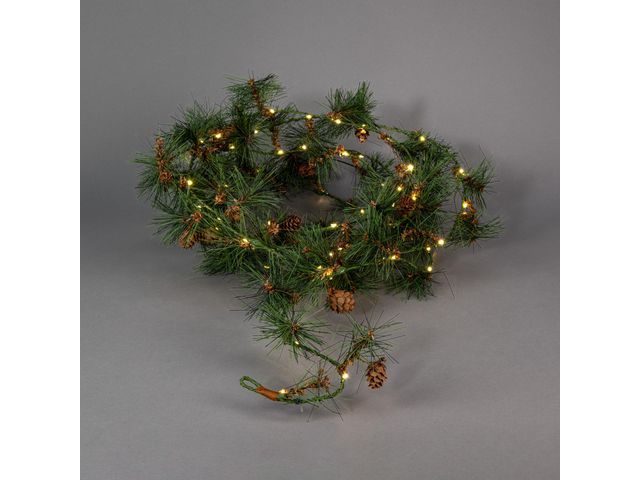 Denna vackra girlang med konstgjorda små kottar och tallbarr ger ett varmt, stämningsfullt sken med sina 60 varmvita LED-lampor. Den är perfekt för att skapa en magisk vinterstämning både inomhus och utomhus. Med sin naturliga design, praktiska batteridrift och 6-timmars timer är ljusslingan en elegant och lättplacerad detalj som lyfter dina vinter- och juldekorationer.