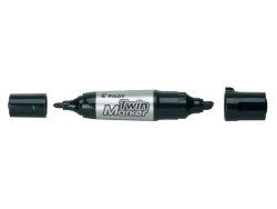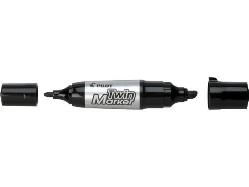 Märkpenna Pilot Twin-Marker Jumbo för permanent märkning på papper, metall, glas, plast, trä och kartong. Med två olika spetsar, en snedskuren spets med två linjebredder 1,0mm och 6,0mm samt en konisk spets med linjebredd 1,0mm. - Permanent bläck - Med huv - Rund och Snedskuren spets - Spetsbredd: 4-7 mm - Linjebredd: 1-6,5 mm - Textfärg: Svart