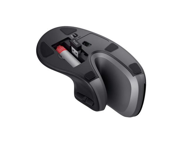 Trådlös mus med ergonomisk vertikal design som minskar påfrestningen på arm och handled.