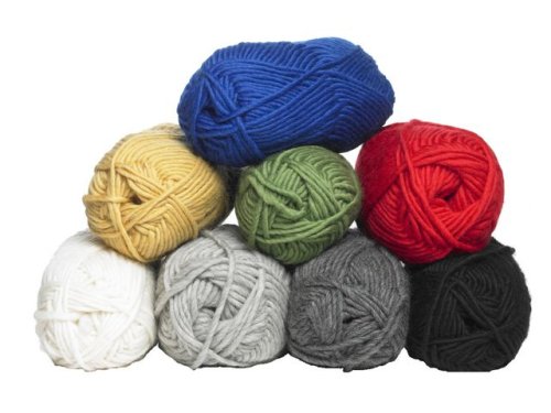 Garn av 100% ull. Perfekt att tova i tvättmaskin i 40 grader. Varje nystan väger 100 gram och det ligger 100 m per nystan. Stickor nr 6 - 7 . Förpackning innehåller: Svart, ljusgrå, mörkgrå, naturvit, röd, blå, grön och gul.