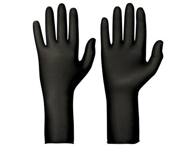 Svarta puderfria engångshandskar med elektrostatiskt dissipativa egenskaper mikroruggad ytstruktur på fingertopparna för bättre grep p. Starka och elastiska. Även testad och godkänd för olika kemikalier (EN 374).