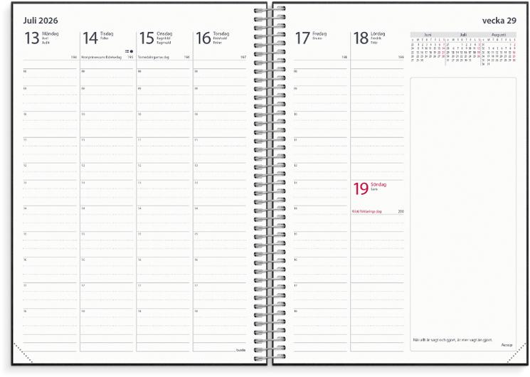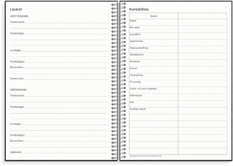 Effektivisera din vardag som lärare med hjälp av en lärarkalender, som ett analogt komplement till din digitala planering. Kalendern ger dig även möjlighet att se över utmaningar och framgångar i din vardag som lärare. Här finns plats för allt ifrån scheman och klasslistor till betygstabeller. Veckouppslagen innehåller mycket plats för anteckningar då vartannat uppslag innehåller ett vertikalt veckouppslag med timindelning 8-18 och vartannat uppslag innehåller anteckningssidor. Falsat ark för elevnamn ingår.