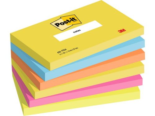 Använd dessa Post-it® Sticky Notes för snabba memo, meddelanden och att göra-listor. Skapa iögonfallande anteckningar och idéer med dessa Post-it® klisterlappar i serien Energetic Colors. Dessa Post-it® klisterlappar är tillverkade med PEFC ? -certifierade pappersfibrer och är det miljövänliga valet för dina anteckningar. Post-it®-anteckningar är extremt flexibla och kan användas för en mängd olika ändamål, från snabbt nedskrivning av telefonnummer och huskelistor till idéer du inte kan glömma och meddelanden till kollegor, vänner eller familj. De borttagbara anteckningarna fästs enkelt på olika ytor, t.ex. arkiveringsskåp, dörrar och väggar eller på insidan av planering av kalendrar, bindemedel och dagböcker och tas bort igen utan att lämna märken. Varje paket innehåller 6 block i 5 klara färger så att du kan lägga till din egen touch och markera dina anteckningar. Varje block mäter 76 x 127 mm och innehåller 100 ark med klisterlappar. - 76x127mm