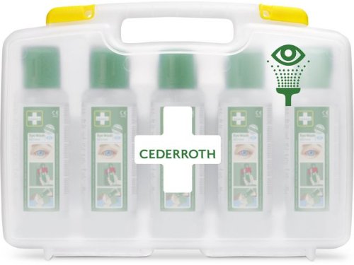 Praktisk väska innehållande 5x500ml ögondusch som är lätt att bära med sig vid exempelvis mobilt arbete eller under transport till sjukhus.