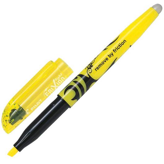 Med överstrykningspennan Frixion Light markerar du och raderar dokument utan att skada dem. Den raderbara överstrykningspennan Frixion Light använder värmekänsligt bläck i ljusa färger som kan raderas helt genom friktionsgenererad värme med radertoppen. Markera självsäkert och sudda så mycket du vill utan att skada dokumenten tack vare den unika spetsen som gör att papperet värms upp snabbt och bläcket blir transparent. Pennan har patenterad bläckteknik i form av mikrokapslar som försvinner med värmegenered friktion och syns igen när dokumentet kyls i fryslika temperaturer. Överstrykningspennan har också en medellång snedskuren spets och markerar enkelt direkt. - Med huv - Radergummi på pennans topp - Snedskuren spets - Linjebredd: 3,8 mm - Textfärg: Gul - Färg pennkropp: Gul - Tillverkad av 50% återvunnet material