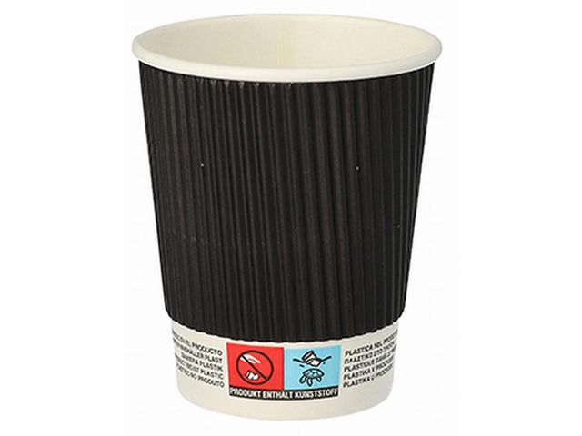 Mått: Ø 8 cm · 9 cm Volym: 0,2 L Material: Ripple Wall kartong med PEbeläggning Färg: Svart Tål värme upp till 90 °C, ej lämplig för alkoholhaltiga drycker Trendiga kaffekoppar i snygg kartong som avleder värme ifrån handen. Varm inuti, kall utanpå! * Papstar reko mmenderar