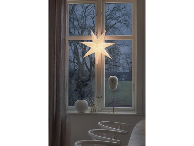 En vacker adventsstjärna med dekorativt mönster att hänga upp i fönstret. Hängande pappersstjärna med 7 uddar och broderat mönster. Sladdställ med 5 meter anslutningssladd ingår, E14-sockel. Sladdströmbrytare. Diameter 60 cm  - Färg: Vit  - Material: Papper  - Bredd: 60cm  - Djup: 19cm  - Höjd: 60cm  - Sockel: E14  - Anslutningskabelns längd: 500cm  - Anslutningskabelns färg: Vit  - Ljuskälla ingår ej  - IP20/230V