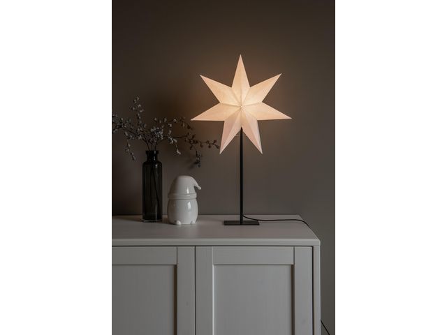 Pappersstjärna med 7 uddar på svart metallfot. Anslutningssladd på 2,4 meter med sladdströmbrytare. E14-sockel (ljuskälla ingår ej). Diameter 40 cm, Höjd 65 cm.  - Färg: Greige  - Material: Papper/metall  - Bredd: 40cm  - Höjd: 65cm  - Djup: 12cm  - Sockel: E14  - Anslutningskabelns längd: 240cm  - Anslutningskabelns färg: Svart  - Ljuskälla ingår ej  - IP20/230V