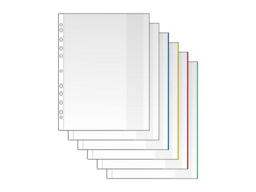 Plastficka A4 med vikt klaff och blå kant. 11 hål - Storlek: A4 - Tjocklek: 0,12 mm - Material: Polypropylen - Med vikt klaff - Färg: Transparent med blå kant - Antal: 100