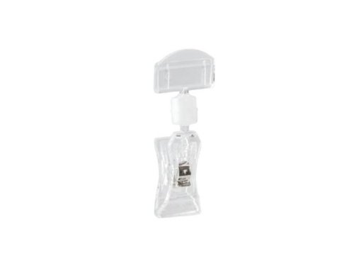 Genomskinlig prisskyltshållare av mindre storlek med en ledad klämma. Klämman kan hålla material från 0- 12mm i diameter.