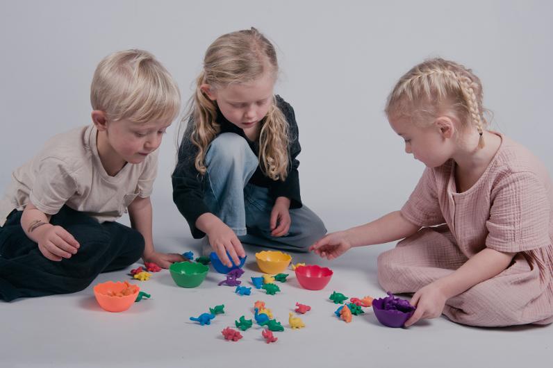 Färgglada dinosaurier som gör sortering och räkning roligt och lärorikt. Med den medföljande tärningen kan barnen öva färger, klassificering och matematiska färdigheter på ett lekfullt sätt. Perfekt för pedagogiska aktiviteter hemma eller i skolan.