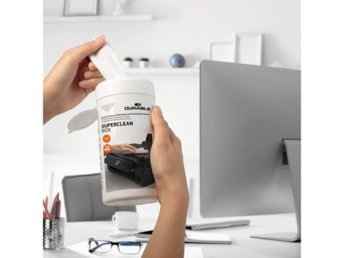 Rengör och minska mängden bakterier med en enkel svepning med dessa Durable Superclean rengöringsdukar i ett praktiskt 100-pack. Torka av datorchassin, skrivare och även telefonhandtag med dessa Durable Superclean rengöringsdukar. De styckförpackade dukarna är förindränkta med rengöringsvätska, vilket gör det lätt att öppna och torka. De är alkoholfria, har en antistatisk effekt och biologiskt nedbrytbara. - Rengör hårda ytor och eliminerar bakterier - Alkoholfria - Biologiskt nedbrytbara - Färg: Vit - Individuellt förpackade servetter