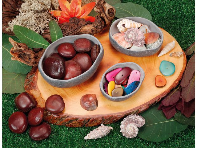 Den här uppsättningen med tre skålar inbjuder till undersökande lek och är lämpliga att använda i vatten, sand och lera. De kan användas för att transportera och visa olika material i alla årstider. Skålarna kan lätt tvättas rena efter användning, redo att fyllas upp och användas en annan dag.