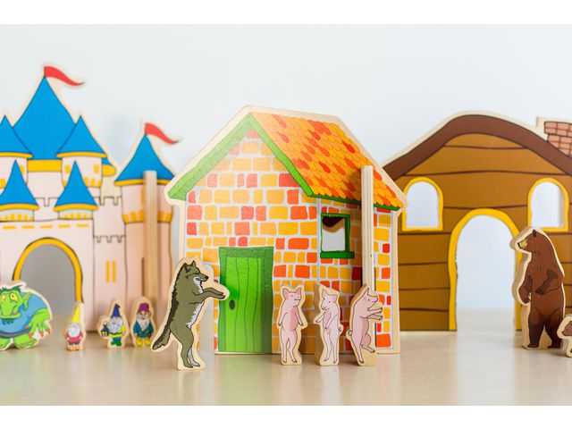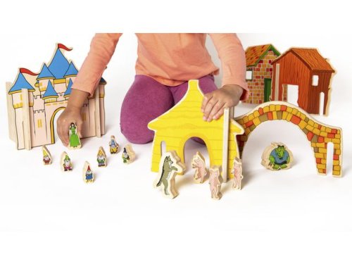 Kreativ lek och berättande rullade ihop i en fantastisk träuppsättning. Barn kommer att ha timmar av öppen lek medan de lär sig om d e mycket älskade sagofigurerna i denna uppsättning. Innehåller husen och figurerna till sagorna Guldlock och de 3 björnarna, De 3 sm å grisarna, Snövit och Bockarna Bruse. Husen sätts enkelt ihop med varandra. 2 cm tjocka sagofigurer med tryck på bägge sidor. Kompl ettera gärna med sagofigurerna 260998.Mått: på största huset 25x25, minsta huset 20x20 cm. Material; tillverkat av FSC-märkt lin dträ. PVC-fri. Från 3 år.