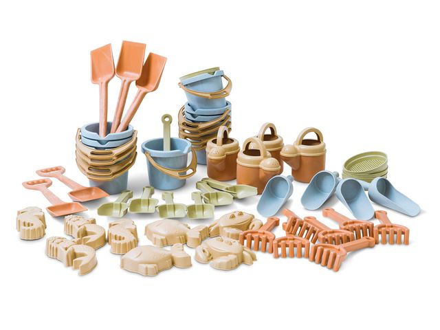 Sandset i 50 delar från danska Dantoys, gjort på Svanenmärkt bioplast. Då produkten är tillverkad av sockerrör är den 100% återvinningsbar.