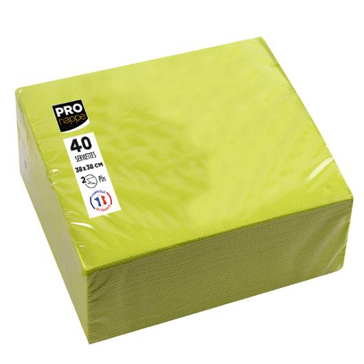 40 mikropräglade servetter 38x38 Varumärket Pro Nappe erbjuder bordsserviser: dukar, servetter, tallrikar och koppar i ljusa, trendi ga färger för att dina gäster ska känna sig välkomna med stil. Våra 2-lagers servetter erbjuder maximal komfort och ger ditt bord de n elegans det förtjänar, både på restaurang och hemma, för alla tillfällen: födelsedagsfester, bröllop, dop, jul. Den dubbla mikropr äglingen ger dem en tjocklek och hållfasthet som är idealisk för vikning. Deras storlek på 38x38 cm är idealisk för användning vid b ufféer, grillfester, aperitifer och både avslappnade och eleganta middagar. Dessa FSC®-certifierade servetter kommer från ansvarsful lt förvaltade källor. Produkterna tillverkas i Frankrike och är certifierade för kontakt med livsmedel. Bläcket är lämpligt för anvä ndning och varken rinner eller bleknar i ljuset.
