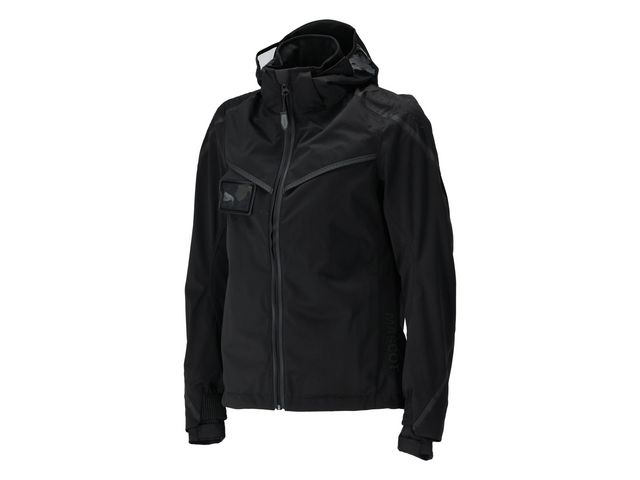 Jackan har andasfunktion och är både vind- och vattentät med tejpade sömmar för extra skydd. Stängningen består av en blixtlås och ett invändigt vindfång, medan den fodrade och löstagbara huvan har genomskinlig plast på sidorna. En hög krage och flera fickor, inklusive innerfickor och framfickor med blixtlås, ökar dess funktionalitet. Avtagbar ID-korthållare, ergonomiskt utformade ärmar för rörelsefrihet, resår i manschetten och ribbstickning vid handleden med tumhål ger extra komfort. Den förlängda ryggen med blixtlås invändigt gör det enkelt att lägga till tryck eller broderi. Reflexeffekter förbättrar synligheten och säkerheten.
