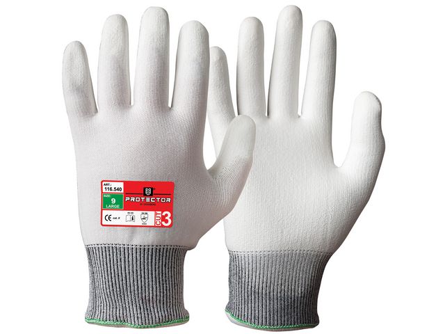 Montagehandskar Protector by Granberg med skärmotstånd 3. Typhoon-fiber med PU-beläggning. Sömlösa. Smidiga, slitstarka och rivstarka montagehandskar med skärmotstånd 3 (EN 388:2003), som ger ett bra skydd mot vassa kanter och föremål samtidigt som du bevarar fingerkänsla och greppstyrka. Lämpliga för montagearbeten eller hantering där du löper stor risk för stick- och skärsår, såsom glashantering, lagerarbete, underhållsarbete.