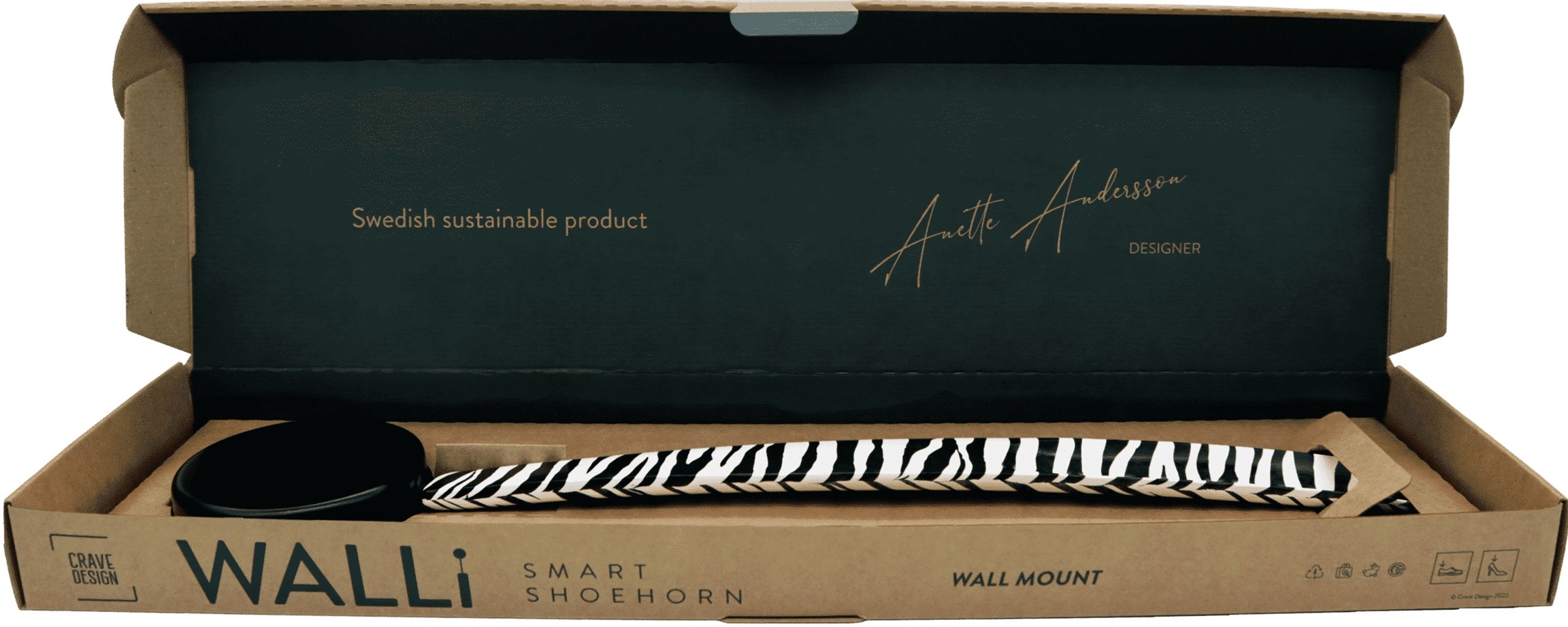 Svart/zebra utdragbart Walli skohorn av återvunnet trä som du hänger på väggen.