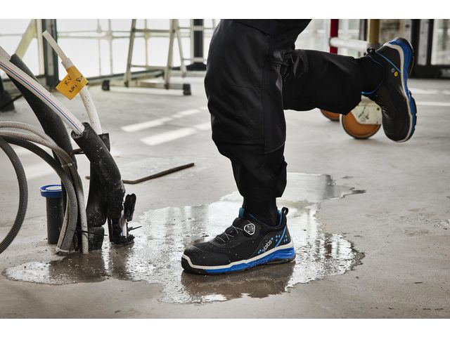 En mjuk, stabil och vattenavvisande skyddssko som är bekväm att bära en hel arbetsdag.