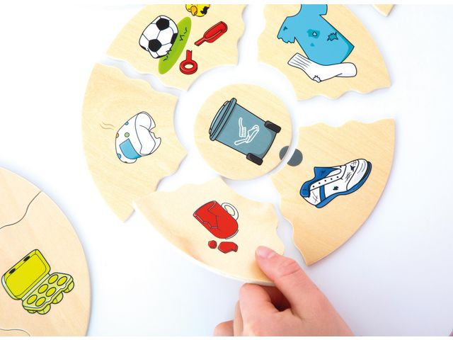 Fem pusselbitar passar runt motsvarande soptunna. Bitarnas konturer gör det enkelt för barnen att själva kontrollera om det blivit rätt.