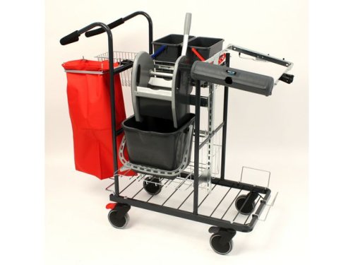 Stor städvagn med svabbutrustning. Steglös höjdjustering av svabbutrustning för bästa ergonomi. Kullagrade komposithjul 125mm med lätt och tyst gång. Specialfunktion med ett riktningshjul och en totalbroms. Levereras i delar som är lätta att montera ihop.