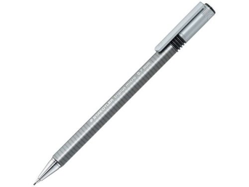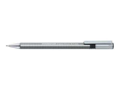 Den mekaniska blyertspennan STAEDTLER triplus® micro 774 har smarta funktioner som ett extra stort radergummi, en skyddande stifthylsa och ergonomisk pennkropp. Den triangelformade kroppen gör den mekaniska pennan enkel att hålla i när man skriver eller ritar. Den har en kork med en fickklämma som döljer ett extra stort radergummi som är PVC- och latexfritt. Den förkromade metallspetsen skyddas av en stifthylsa när den inte används, vilket gör den mekaniska pennan ficksäker. - Klickmekanism - Med suddgummi - Spetsbredd: 0,7 mm - Hårdhetsgrad: B - Färg pennkropp: Grå