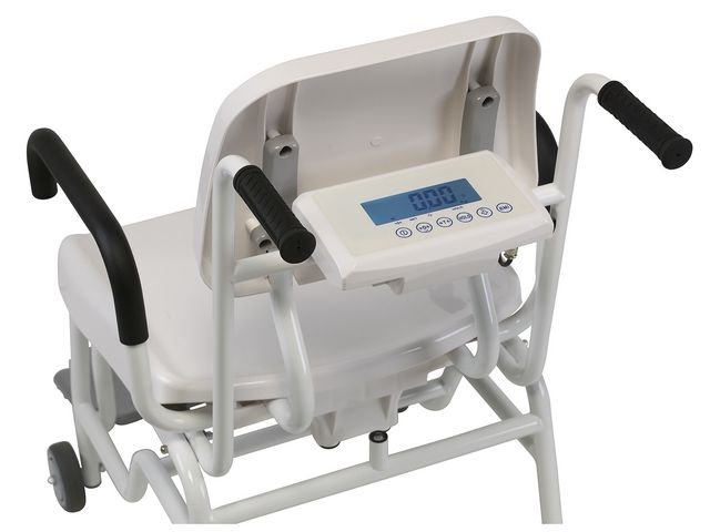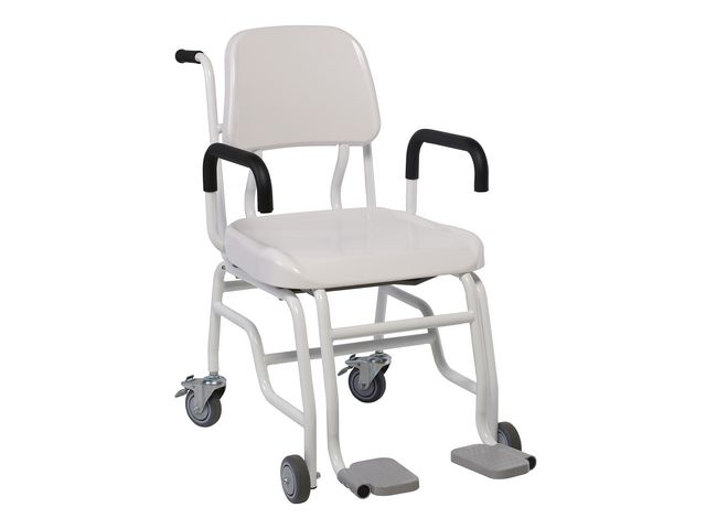 Robust och säker stolvåg med lyftbara armstöd och flyttbara fotstöd för att underlätta i- och ursittning. De bakre hjulen är svängbara och försedda med lås för bästa vägning och säkerhet. Sits i ABS-plast och pulverlackerd rörram gör vågen enkel att rengöra.