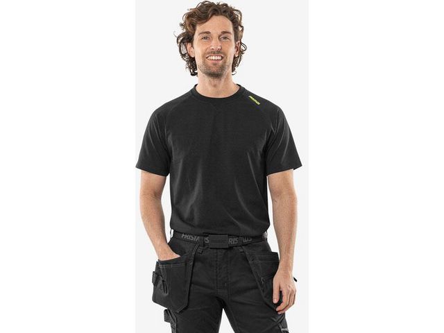 Slitstark T-shirt för arbete inom bygg och industri T-shirt i kraftigt stretchmaterial som kombinerar återvunnen polyester och bomull för hög komfort och hållbarhet. Med 4-vägsstretch erbjuder den optimal rörelsefrihet och en slitstark design som klarar tuffa arbetsförhållanden. Den stilrena finishen gör den lika lämplig på jobbet som till vardags. - Material: 63% återvunnen polyester, 32% bomull, 5% elastan. - Vikt: 235 g/m2 - Tvättråd: 60° - EN 13758-2 ? UV-skydd - Oeko-Tex Standard 100: SE 23-310 RISE, www.oeko-tex.com