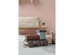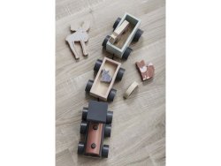 Ett tåg i trä med ett lok och två vagnar som lätt kopplas av och på.