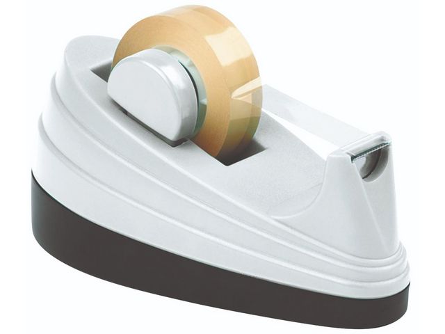 Vit tejphållare med svart botten som passar för 19 mm breda tejprullar med upp till 33 m tejp. Tillverkad i svart plast.