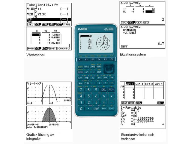 Grafritande räknare med monokrom display, omfattande grafiska funktioner och numerisk integralberäkning.