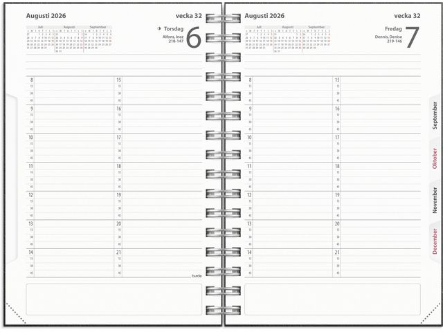 Kalender 2026 från Burde. Format: 135x205 mm. Layout: Dag/sida. Kvartsindelning 8-22. Kalendarium: 2026-01-01 - 2026-12-31. Omslag:Kartong. Spiralbunden. Innehåll: Kyrkliga helgdagar, Flaggdagar, Helgdagar/aftnar, Månfaser, Namnsdagar, Internationella helgdagar översikt, Urstansat månadsregister, Temadagar/händelser, Årsöversikt/årsöversikter, Årsplan/årsplaner. Antal sidor: 400. Miljöinformation: FSC®.