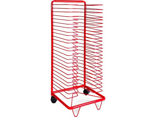 Mobil torkställning på hjul med 25 st torkhyllor. Metallram som används för torkning av stora ark såsom collage, målningar, foton. Pulverlackerad metallram. Monteras enkelt enligt medföljande instruktionerna. Mått: 43x33x90 cm. 3,5cm mellan hyllorna. - 7 cm mellan lamellerna