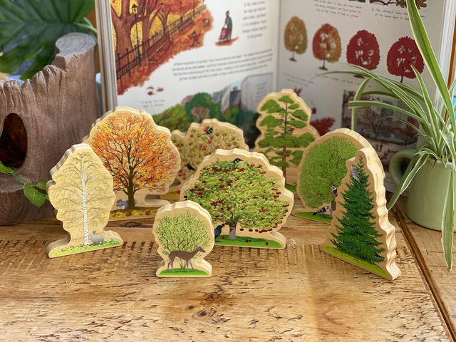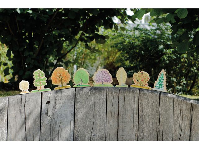 Åtta olika typer av träd, visar två säsonger vardera, och hela setet innehåller fyra säsonger, vilket ger mycket att prata om och flexibilitet i leken. Matchande basfärger för varje årstid hjälper till med sorteringen. Setet innehåller åtta träbitar som föreställer följande träd: äpple, bok, körsbär, douglasgran, hassel, ek, tall, silverbjörk. Titta noga och du hittar massor av djur och säsongsbetonade detaljer, inklusive bi, koltrast, fjäril, korsnäbb, kråka, rådjur, guldkräm, nötskrika, långörad uggla, merlin, mus, fasan, kanin, rödhake, ekorre, hackspett.