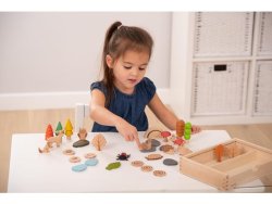 Djuren, löven och stockarna har laserade detaljer som skapar en lätt fördjupning i träet, vilket ger en taktil sensorisk upplevelse och gör dem även idealiska för kol- eller kritritningar. Spåren tillhör hjorten, räven, kaninen, ugglan, igelkotten och ekorren. Upprättelsen inkluderar 5 x 3D-träd, 5 x 2D-löv med laserade markeringar, 8 x 2D-djur med laserade markeringar (uggla, kanin, hjort, ekorre, räv, igelkott, snigel, fjäril), 2 x 3D-småkryp med detaljer av konstläder (nyckelpiga, gråsugga), 2 x 3D-svampar, 6 x platta stenar och vattenformer, 6 x stockskivor med laserade träringsmönster på ena sidan och laserade djurspår på den andra, en 2-delad bro/båge och en träbox med genomskinligt akryllock. Stödjer följande inlärningsområden: