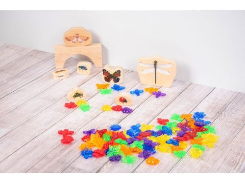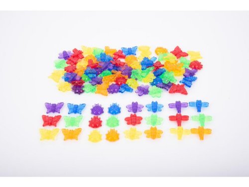 De genomskinliga färgerna gör dem perfekta att använda på en ljuspanel och de detaljerade funktionerna ger en taktil dimension till setet. Innehåller 4 varianter (fjäril, nyckelpiga, trollslända och bi) i 6 färger (röd, orange, gul, grön, blå och lila) i en praktisk förvaringsburk med lock. Stödjer följande lärandeområden: