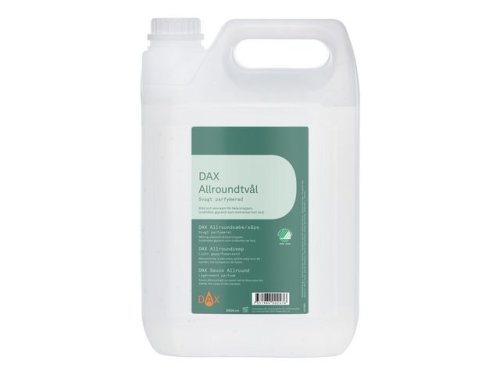 Skonsam mot huden, även vid frekvent användning, passar även till hårtvätt. Händerna utsätts för extra mycket påfrestningar när huden exponeras för kyla och frekvent tvättande med tvål och varmt vatten, så det är viktigt att välja en mild och skonsam tvål. DAX Allroundtvål är en extra mild och krämig tvål som passar för såväl kroppstvätt som hårtvätt. Rengör huden varsamt utan att torka ut och lämnar en fräsch känsla. Produkten är miljömärkt med Svanen. Allroundtvålen är kompatibel med tvåldispensrar eller används direkt från dunken och är perfekt hemma eller på kontoret. - Lätt tvål utan parabener och färgämnen - Svag parfym lämnar en fräsch doft - Volym: 5l - pH-värde: ca 4,5 - Lukt: Parfymerad - Utseende: Vit krämig - Svanen: Licensnummer 50900050