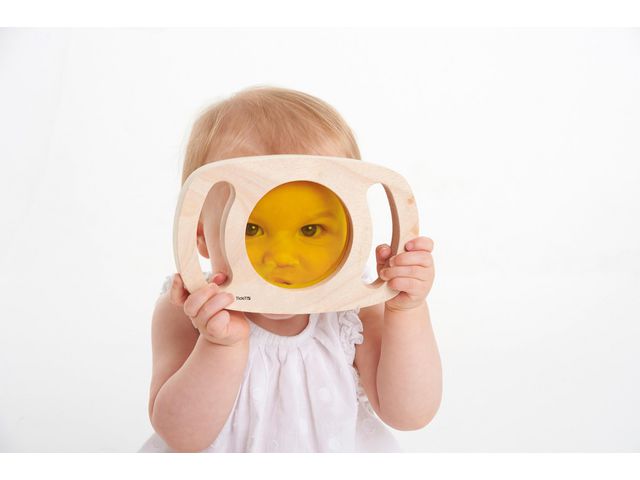 Låt barnen se världen med nya ögon. 3 akrylfärgpaneler i ljusrött, blått Varje ram är 18 x 120 x 2 cm, fönster Ø 8 cm.