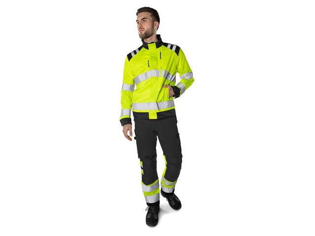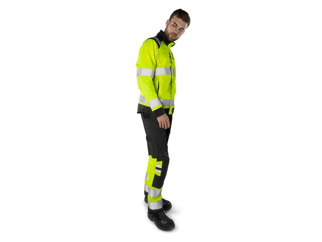 Miljödeklarerade varselbyxor med stretchpartier i midjan för extra komfort. Bekväma arbetsbyxor med praktiska fickor, tillverkade i ett lätt och slitstarkt material av återvunnen polyester och ekologisk bomull. Byxorna har en förstärkt tumstocksficka med plats för verktyg, pennor samt knapp och knivhälla.