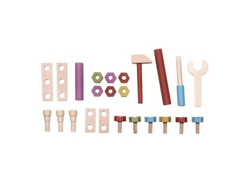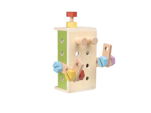 Verktygslåda, snickarbänk eller robot? Det bestämmer du! Med verktygslåda bygg låda, hammare, skruvmejsel och skiftnyckel kan kreaktiviteten flöda. Byggmaterial ingår med: sex skruvar, sex muttrar, tre spikar, fyra byggplattor med hål i två längder, två rundstavar i två längder, samtliga 25 delar är i trä och färgade i klassiska Mickifärger.