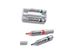 Här i ett praktiskt set med 4 pennor och magnetiskt tavelsudd.