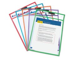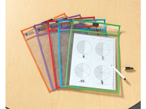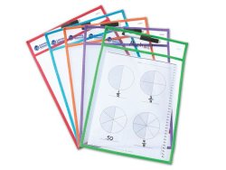 5 stycken klara plastfickor för arbetsblad, levereras komplett med 5 stycken whiteboardpennor med sudd.