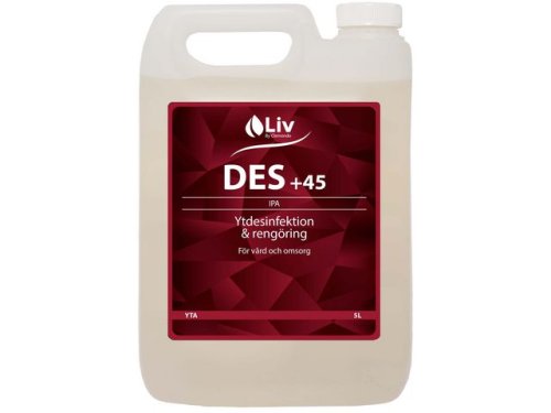 LIV Ytdesinfektion +45 innehåller 45 vol% isopropylalkohol med en tillsats av tensid för att få en rengörande effekt. LIV Ytdes+45 är godkänd för desinficering av Siemens Acuson ultraljudsgivare. Produkten uppfyller de europeiska normerna för desinfektionsmedel EN1276, EN1650, EN14476 (höljesförsedda virus), EN14348, EN14561 och EN14562. Produkten kan användas inom områden där mikrobiologisk smittspridning skall förhindras. Exempelvis vård & omsorg, veterinärmedicin, laboratorieverksamhet, veterinärmedicin, livsmedelsindustri och motsvarande områden. - pH-värde: 8 - Dosering: Används outspädd - Utseende: Färglös/klar vätska